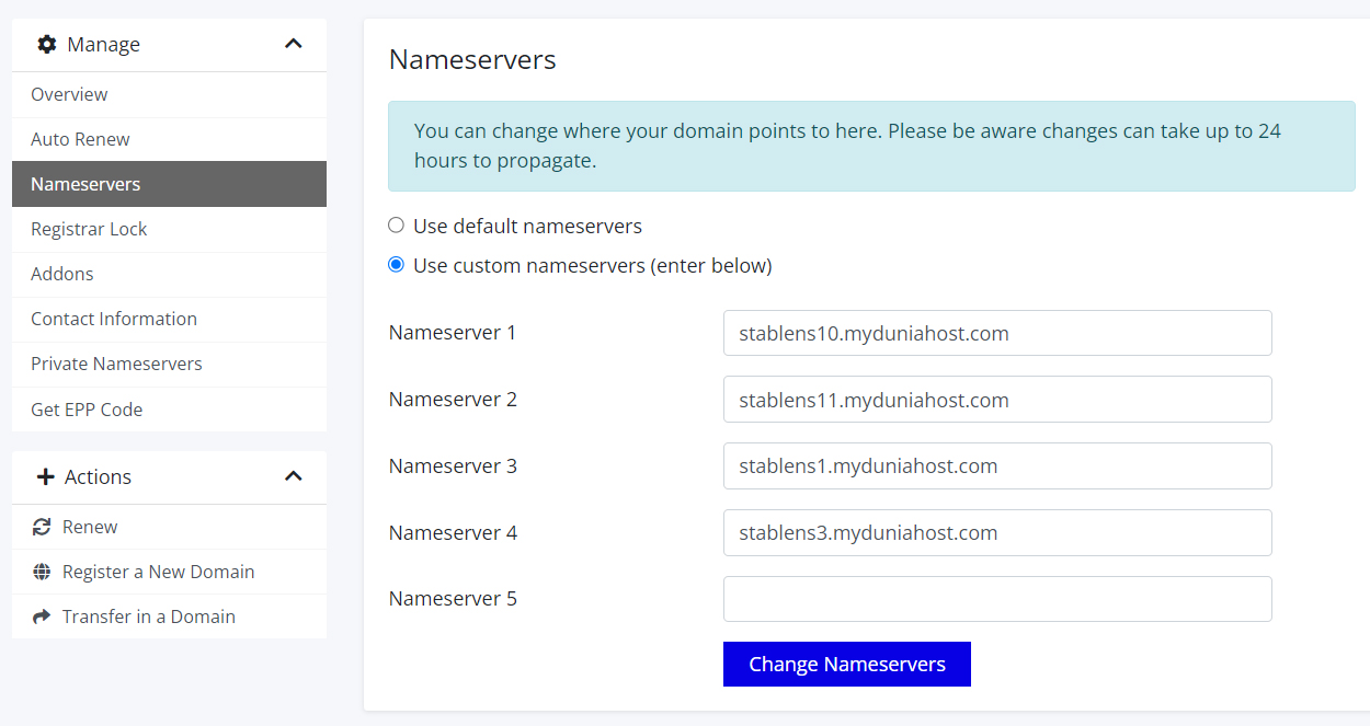 For domains that you register with us, you can make changes from our client area. Please log in and choose My Domains and select your required domain.